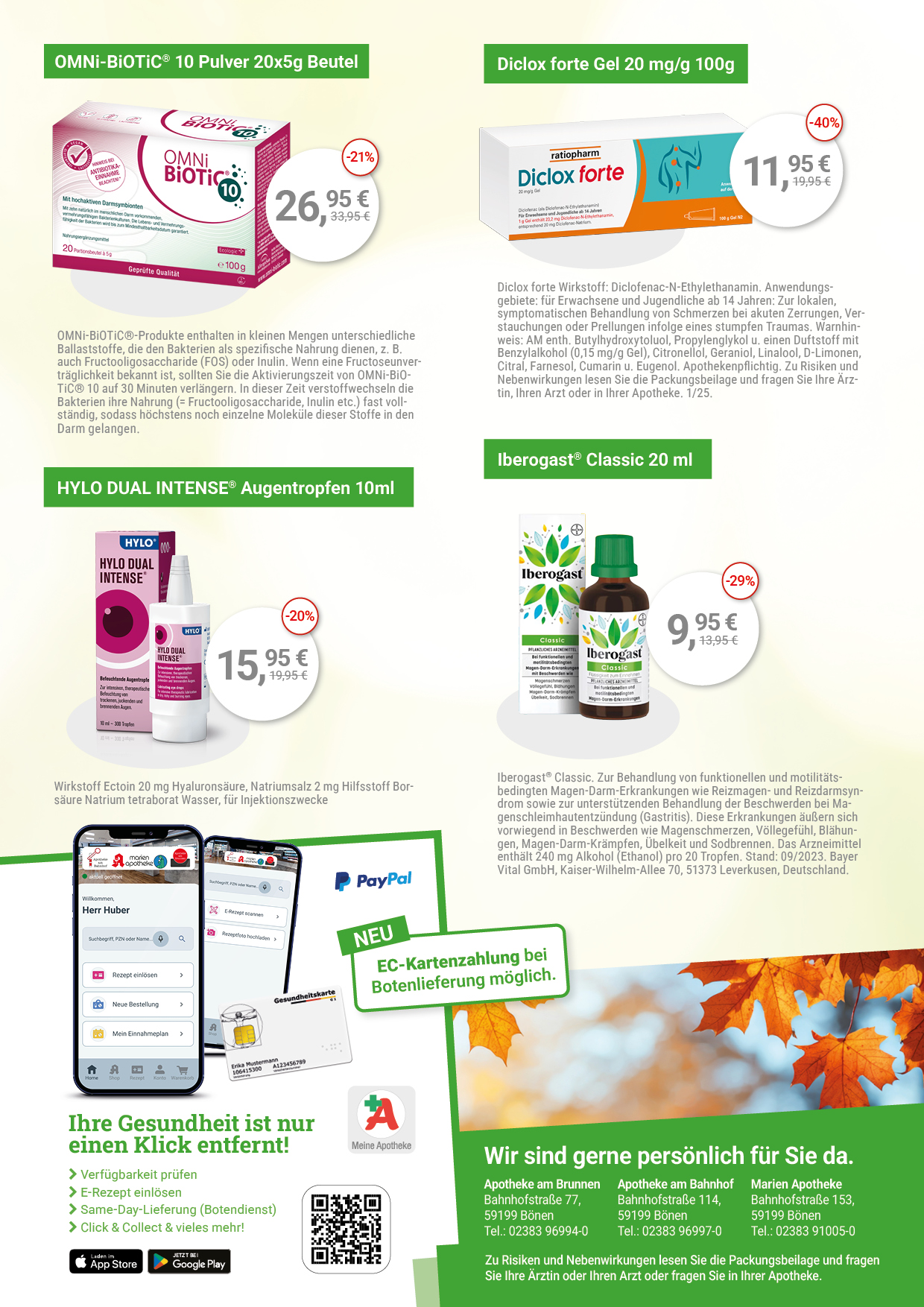 Unsere Apotheke steht nicht nur als vertrauenswürdiger Ort in Ihrer Nachbarschaft, sondern auch als digitaler Begleiter zur Verfügung. Vor Ort bieten wir Ihnen eine persönliche Beratung und Betreuung an. Online stehen wir Ihnen mit derselben Expertise und Fürsorge zur Verfügung. In beiden Dimensionen, physisch und digital, bleiben wir Ihr verlässlicher Partner in allen Gesundheitsfragen.